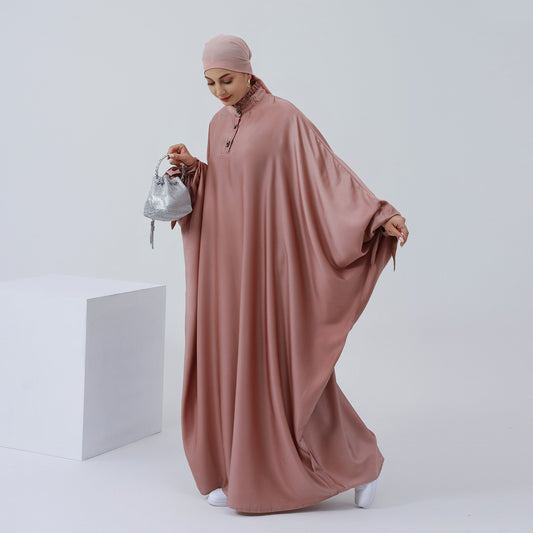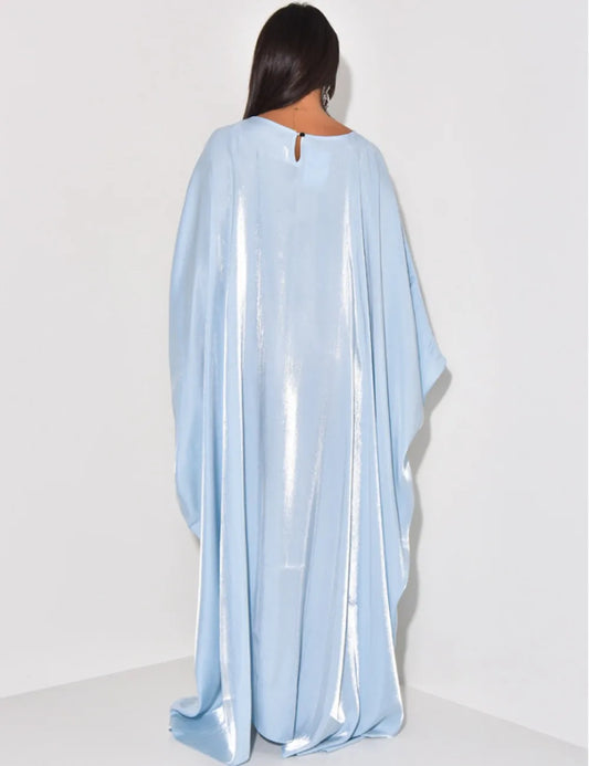 Satin Robe Abaya Dress Muslim Women Elegant Round Neck Bat Sleeve Lace Up Flowing Light